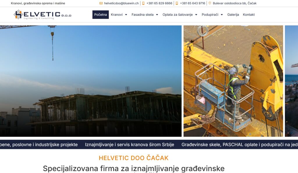 Helvetic DOO Čačak bavi se iznajmljivanjem građevinske opreme i mašina širom Srbije, sa fokusom na kranove, skele, oplate i podupirače. Aktivni smo na tržištu od 2008. godine i za to vreme izgradili smo reputaciju pouzdanog partnera za ozbiljne građevinske projekte – od stambenih i poslovnih objekata do industrijskih i infrastrukturnih radova.